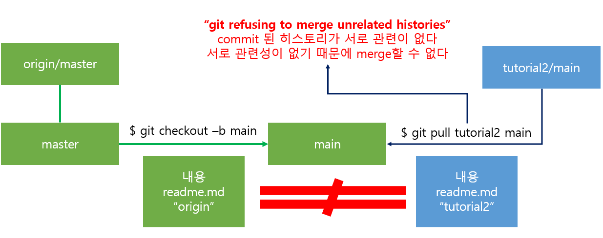 서로 관련 기록이 없는 두 프로젝트를 병합할 때 index트리와 HEAD가 달라서 거부를 할텐데