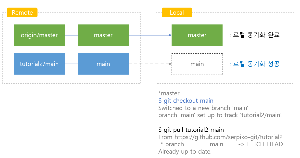 여기에서 원격의 tutorial2/main 브랜치를 로컬로 가져와서 동기화($ git pull) 하고 싶다.
