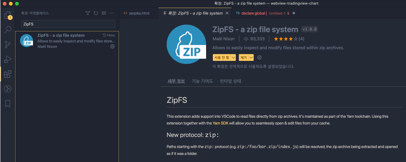 ZipFS 설치: VSCODE의 확장 - 마켓플레이스에서 ZipFS로 검색하여 설치한다