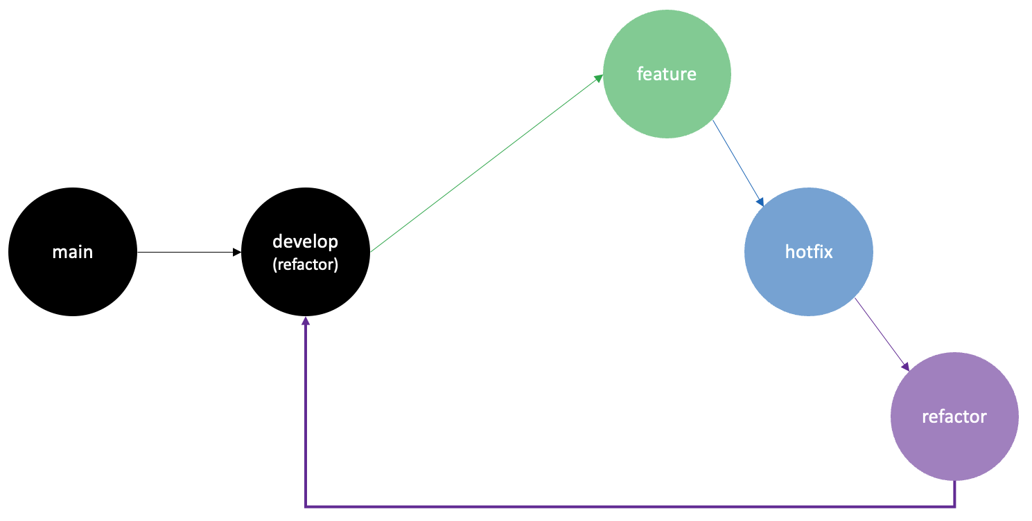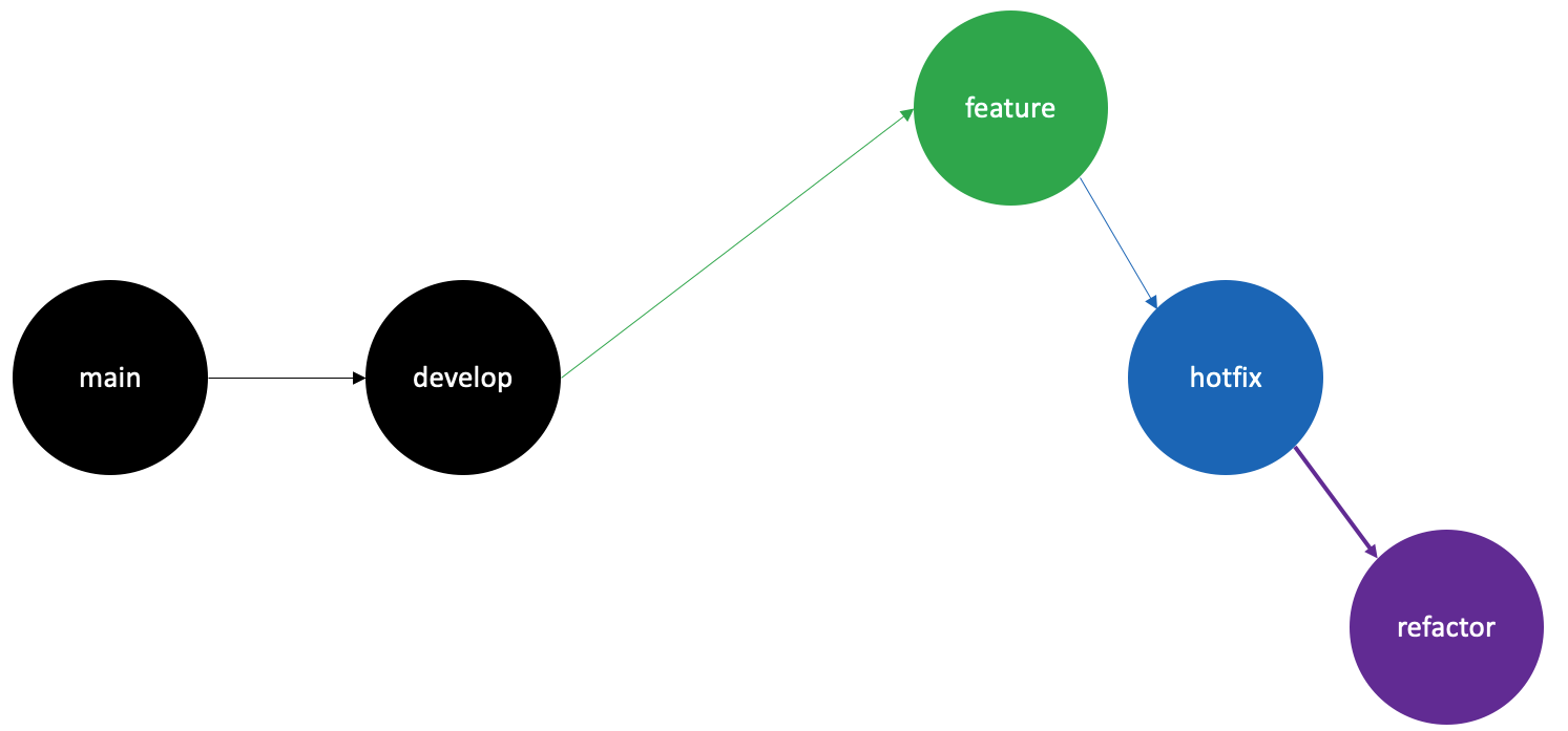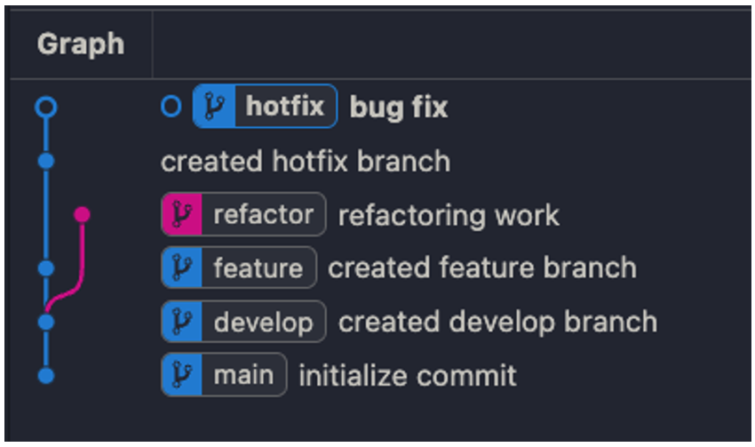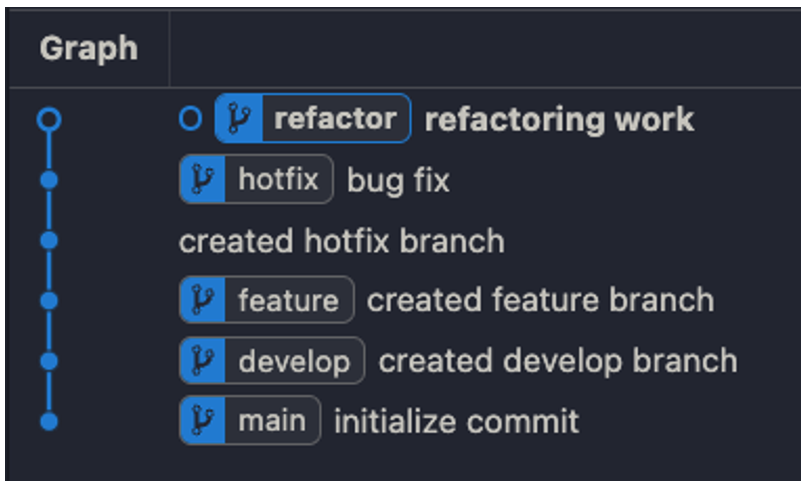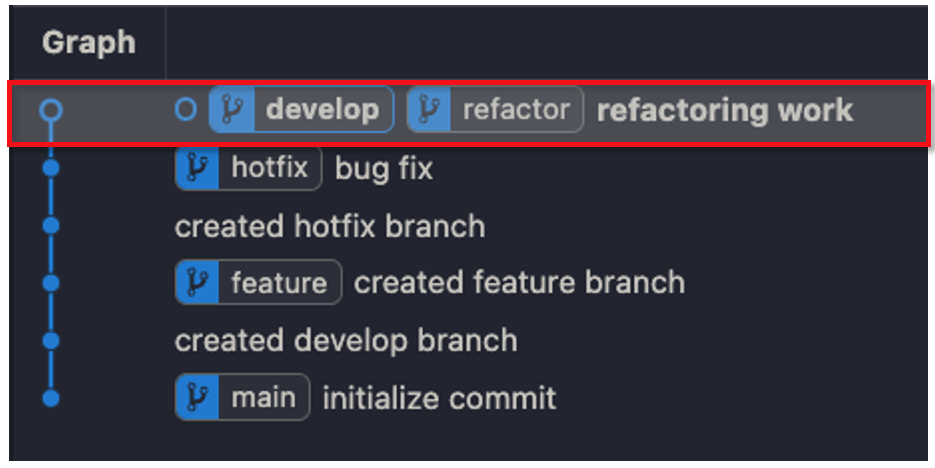 작업 이력이 main => feature => hotfix => refactor => develop 까지 한줄로 표시되었다
