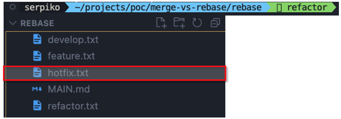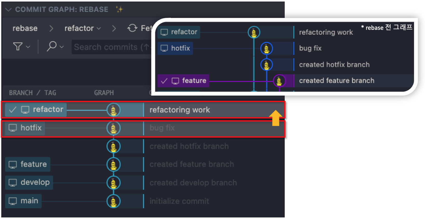refactor 브랜치로 이동하여 hotfix 브랜치를 rebase 한다
