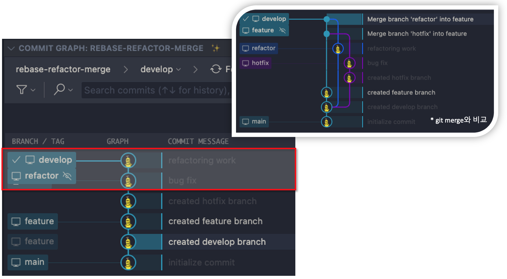 * 여기까지는 git merge와 상황이 완전히 일치한다