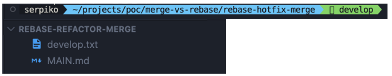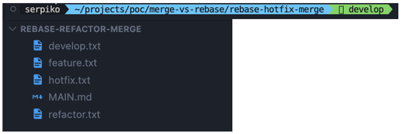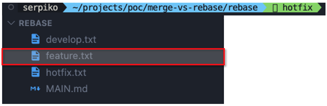 merge와는 다르게(merge의 경우 먼저 feature브랜치로 이동했다면) 이번에는 hotfix 브랜치로 이동한 뒤